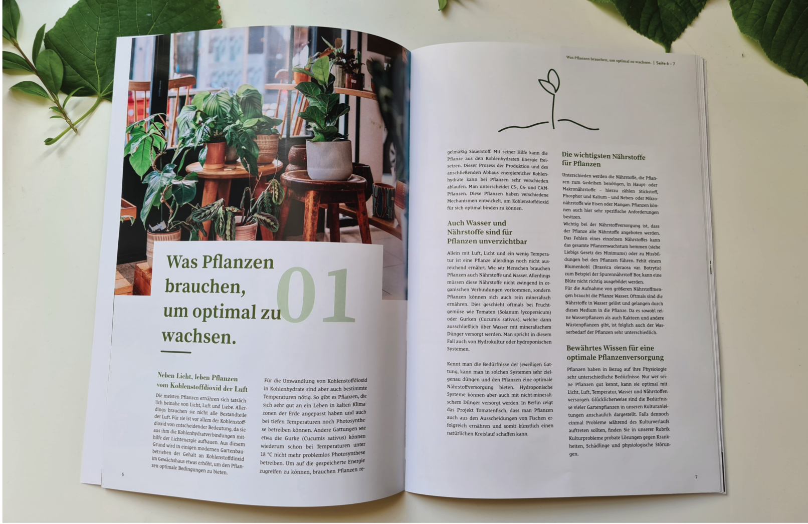 Mit meinem Design wollte ich das Hauptmerkmal auf die Schönheit von Pflanzen richten und mit einem ausgeglichenem Bild-Text Verhältnis dem Leser ein angenehmes lesen ermöglichen.